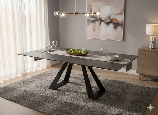 The combination of these materials can create a stylish and durable piece of furniture for your dining area. The sintered stone provides a sleek and modern look, while the black iron base adds a touch of industrial elegance. This type of table is not only visually appealing but also highly practical, as sintered stone is known for its resistance to scratches, stains, and heat. The black iron base complements the stone top and offers stability and sturdiness to the table. Overall, a sintered stone dining table with a black iron base is a fantastic choice for those seeking a blend of aesthetics and functionality in their dining space.