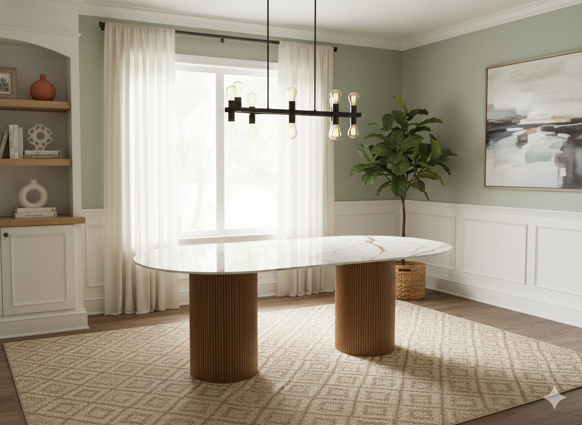 This stunning contemporary dining table features an unique style with white faux marble top. This solid marble top has exquisite white fibre design. This is all supported by wooden base. With the modern look of marble and elegant base this table is sure to be the focal point of any dining space.